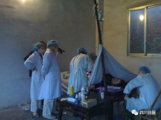 風雨交加中,臨時產房四周沒有遮擋,怕產婦們淋雨,醫生、護士們圍坐在臨時產房四周,形成了一圈人牆。