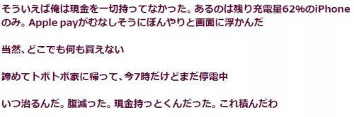 除了這位札幌網友的悲慘經歷,也有不少災民表示自己也習慣使用電子支付,身上沒有現金只能眼巴巴看別人把食物買走。
