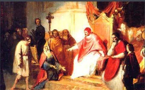 1056年6歲的法蘭克國王亨利四世繼位,1073年新教皇格列高七世宣佈教皇的權利高於一切。1075年,亨利四世新任命主教,與教皇起了衝突,被教皇開除教籍,剝奪皇帝資格,各國王迎風倒。1077年1月,亨利四世帶着妻兒來到卡諾莎城堡謝罪。在冰天雪地裏脱去衣帽,穿着謝罪專用麻衣,凍了三天三夜,各種認罪懺悔之後才被恢復教籍。1080年,教皇再次開除了他的教籍,不過羽翼漸豐的他宣佈廢黜教皇,並率兵圍攻羅馬,教皇倉皇南逃,不久病死。