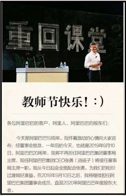 9月10日,是中國的教師節,是中國“鄉村教師”馬雲54歲的生日,也是阿里巴巴的19週年。兩天前,由外媒引起的傳聞,終於塵埃落定。9月10日早上9點10分,阿里巴巴官方宣佈了馬雲的“傳承計劃”。一年後的今天,也就阿里巴巴20週年之際,馬雲將辭任董事局主席,由CEO張勇接任,並且將在2020年退出董事會。