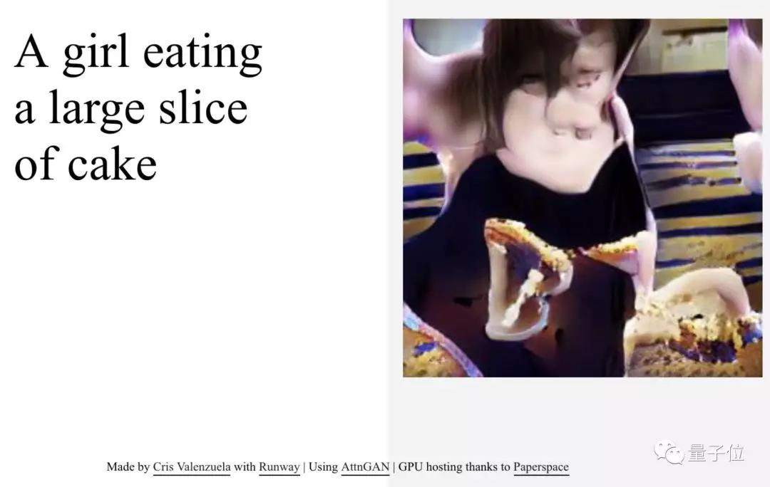 有一張AI根據人類文字描述生成的圖。描述是:一個女孩正在吃一大塊蛋糕。生成的圖片如下方右側所示……