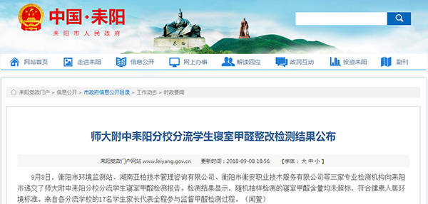 近日,部分網民在網上發貼傳言湖南師大附中耒陽分校新宿舍裝修甲醛超標。耒陽市教育局收到相關信息後立即向市委市政府彙報相關情況。市委市政府對此事高度重視,主要領導第一時間作出指示,並安排分管教育的副市長負責調查處置工作。我市已邀請權威檢測機構對師大附中新宿舍樓等進行檢測(預計9月2號出結果)。檢測結果將第一時間向社會公佈。市教育局將秉承“辦人民滿意教育”的宗旨,堅持以人民為中心,以確保學生健康為根本,妥善處理問題,回答百姓關切。