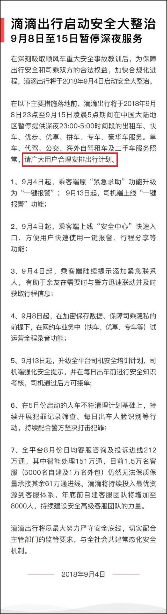 9月4日,滴滴出行發佈了一份安全大整治方案。