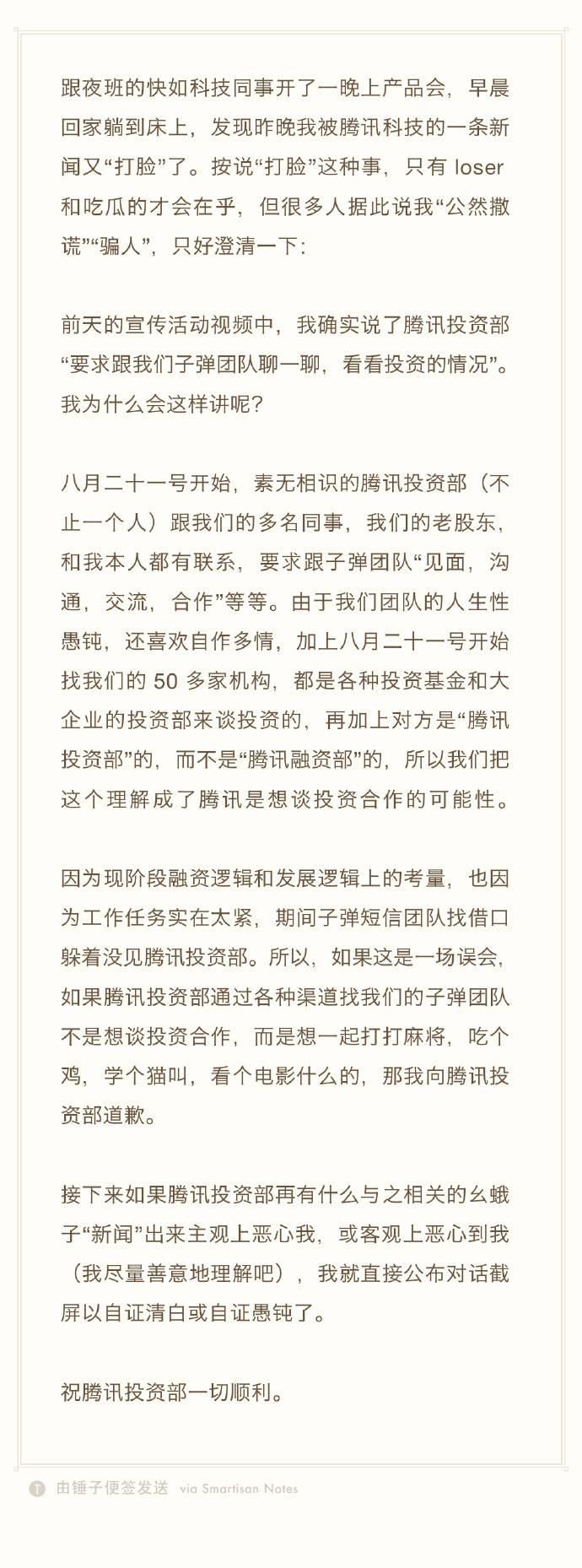 因為現階段融資邏輯和發展邏輯上的考量,也因為工作任務實在太緊,期間子彈短信團隊找藉口躲着沒見騰訊投資部。所以,如果這是一場誤會,如果騰訊投資部通過各種渠道找我們的子彈團隊不是想談投資合作,而是想一起打打麻將,吃個雞,學個貓叫,看個電影什麼的,那我向騰訊投資部道歉。