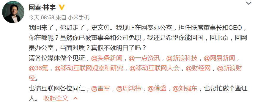 “我回來了,你卻走了,史文勇。我現正在網秦辦公室,擔任聯席董事長和CEO,你在哪呢?雖然你已被董事會和公司免職,我還是希望你能回國,回北京,回網秦辦公室,當面對質?真假不就明白了嗎?”