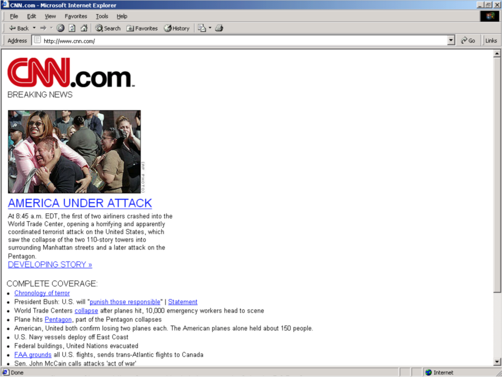 之後各大傳統媒體的新聞網站也開始發佈相關新聞。當時由於網速還是落後,流量還不多。為了將911事件的相關新聞全部登錄到網站上,CNN將自己的網站做了簡化處理,移除了大量圖片。