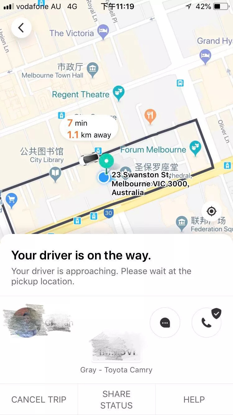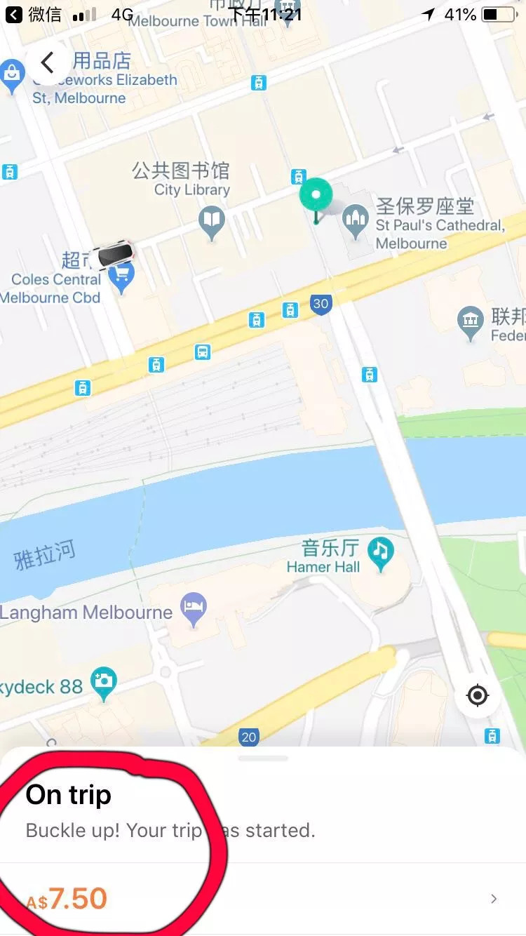從圖中我們看到,手機顯示客人已經On trip並且產生了7.5澳幣的乘車費用)