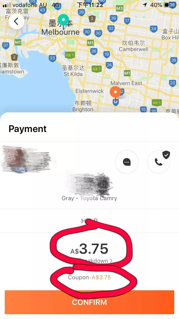然後緊接着,老林的手機便收到通知,司機已完成訂單,請支付3.75澳幣的乘車費用……(而且還因為滴滴澳洲第一次乘車5折的優惠,所以原本7.5澳幣的費用被減了一半,等於沒被坑7.5咱們還得謝謝滴滴)