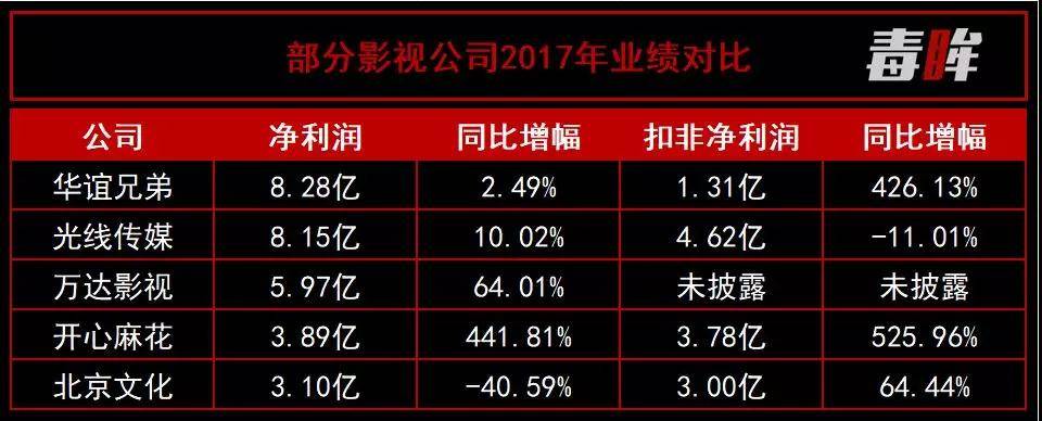 開心麻花2017年財報顯示,公司全年實現營業收入8.22億,同比大增181.60%,淨利潤增幅則高達441.81%,賺了3.89億元,**這個業績已經超過了不少老牌影視上市公司,其2017年扣非淨利甚至是華誼兄弟的3倍。**考慮到《西虹市首富》已經大賣25億,十一《李茶的姑媽》又會上映,不出意外開心麻花今年業績還會有大幅提高。