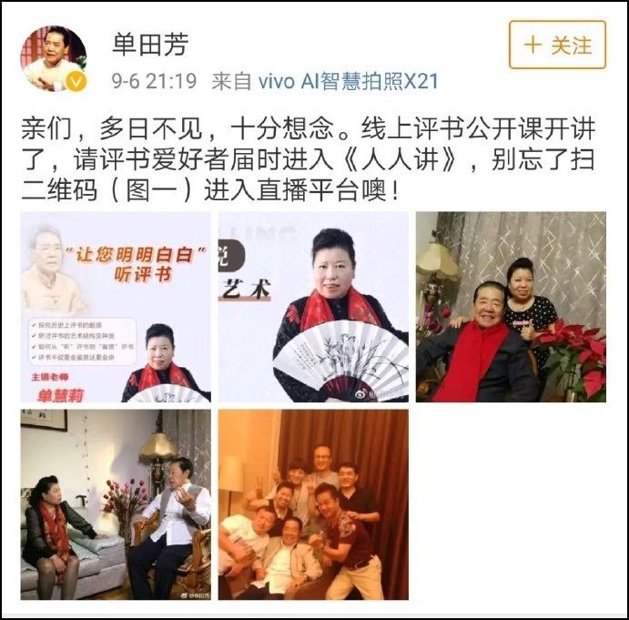 又在數天前,許久沒有更新微博的單老發了文,支持女兒單慧莉的評書公開課。當時不少網友在評論區留言稱“單老師一定要長命百歲”“單老師身體健康”。