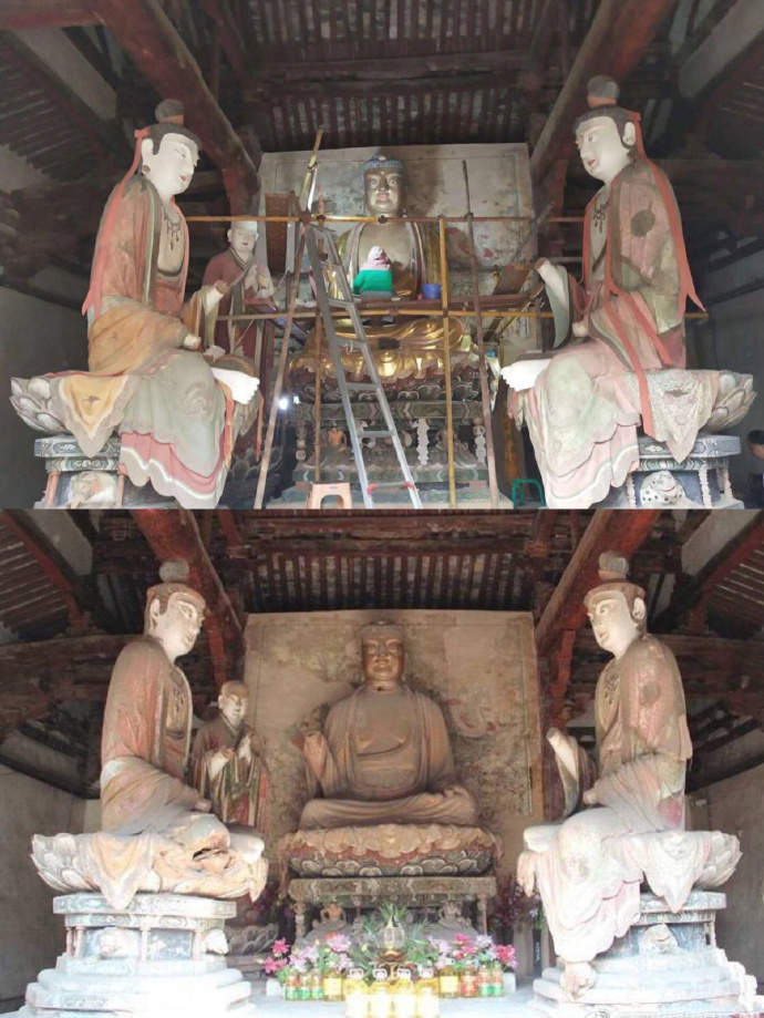 9月11日,網友在社交平台發佈晉城青蓮寺塑像遭受破壞性修復,並配上修復前後的對比圖。照片中顯示,昔日的彩塑缺少了古樸的神韻,變得煥然一新,佛像頭上也加上了之前未有的飄帶,此舉引發文物愛好者關注。