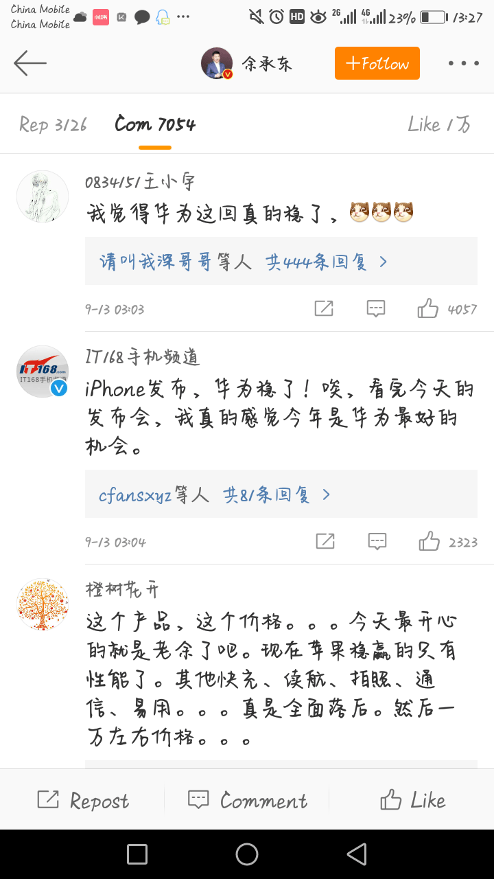在餘承東發佈微博後,媒體和大V陸續轉發微博表示對此次新iPhone的創新有些失望,並紛紛表示華為Mate 20穩了,期待十月份發佈的能夠帶來更多驚喜。