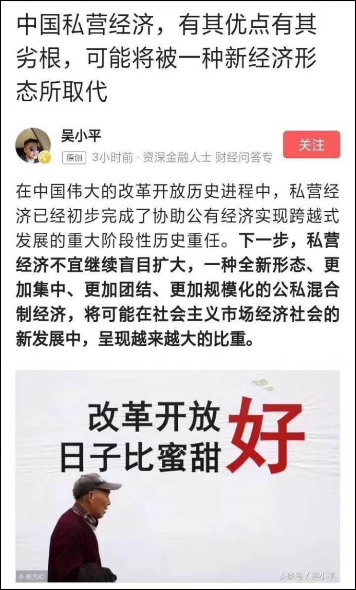 日前,一篇建議中國私營經濟退出的文章在網絡流傳,引發熱議。該文題為《中國私營經濟已完成協助公有經濟發展的任務,應逐漸離場》,作者是自稱“資深金融人士”的吳小平。