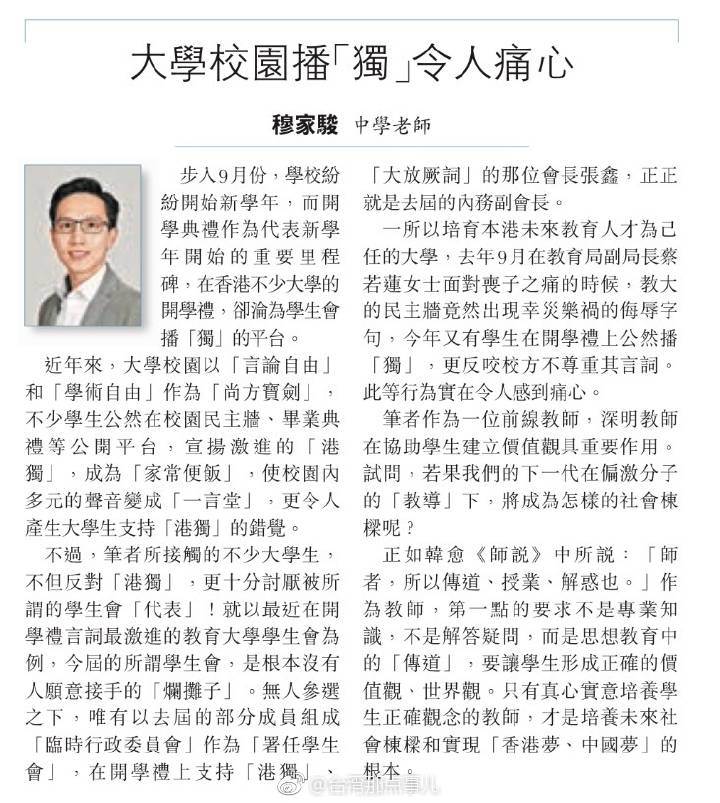 一所以培育本港未來教育人才為己任的大學,去年9月在教育局副局長蔡若蓮女士面對喪子之痛的時候,教大的民主牆竟然出現幸災樂禍的侮辱字句,今年又有學生在開學禮上公然播“獨”,更反咬校方不尊重其言詞。此等行為實在令人感到痛心。