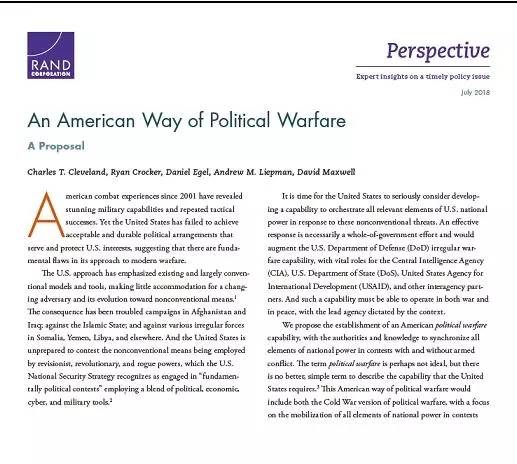 ▲2018年7月24日,蘭德公司網站發佈題為《An American Way of Political Warfare》的報告
