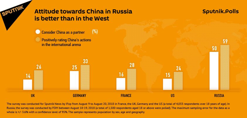 近日,俄羅斯衞星通訊社委託俄羅斯社會輿論基金會和法國IFop市場調查公司,就如何評價中國的對外政策在法國、美國、德國、英國和俄羅斯進行民意調查。民調結果顯示,超過一半的俄羅斯民眾(54%的男性和47%的女性)將中國視為夥伴。