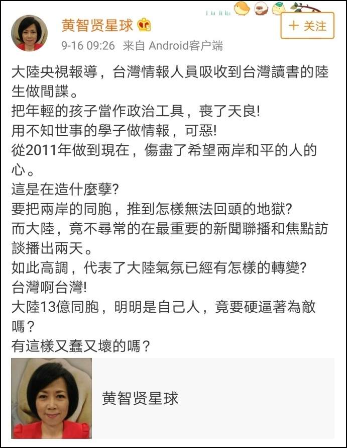 知名主持人黃智賢也在社交媒體上發言稱,“把年輕的孩子當作政治工作,喪了天良!用不知世事的學子做情報,可惡!從2011年做到現在,傷盡了希望兩岸和平的人的心。這是在造什麼孽?要把兩岸的同胞,推到怎樣無法回頭的地獄?”她同樣認為,大陸如此高調地報道台灣間諜一事,顯示了氣氛的微妙變化。