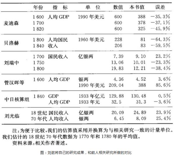 此外,按照劉逖的算法,中國1600年的人均年收入約為白銀4.5兩(合1990年388美元,下同),1840年下降至白銀約3.4兩(318美元)。