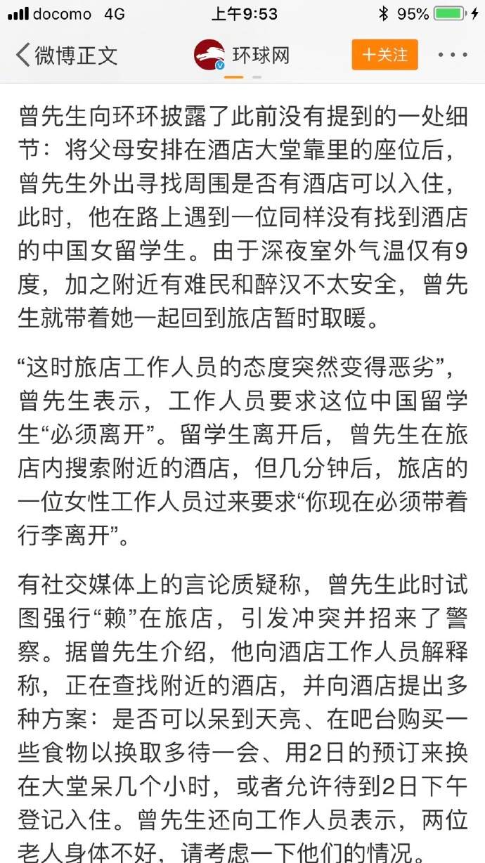 微博@五嶽散人:看了看環球採訪瑞典假摔當事人,這人還真有趣。一個英文溝通流利的、多次出國的、敢帶着兩位老人自由行的遊客,他説自己步行出門尋找有空房的酒店……我寫這條微博的時候,斯德哥爾摩是夜裏三點半,上攜程隨便就查找到了曾先生説的斯德哥爾摩火車站附近的酒店。有房、隨便訂。然後這兄弟從外面帶回來一位同樣找不到酒店的女留學生,擱哪個酒店也驚了:您幹啥的?這是您家酒店麼?本來您在這裏待着就已經算框外了,您還往裏帶人……誰開門做買賣也受不了這樣的。假設這事兒全是真的,這都不算文化衝突與誤解,這完全屬於不懂人事兒。