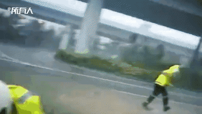 民警迎着巨浪勸阻他們離開:“颱風天氣,請儘快離開,你們車裏還帶着大人小孩一家,非常危險!”