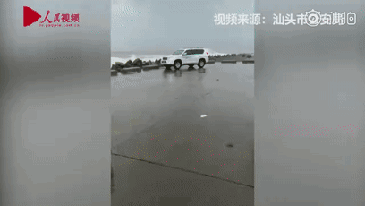 廣東汕頭,東海岸邊竟然有人專門開車帶着家人到海邊看台風,白色SUV在驚濤駭浪中飄搖。