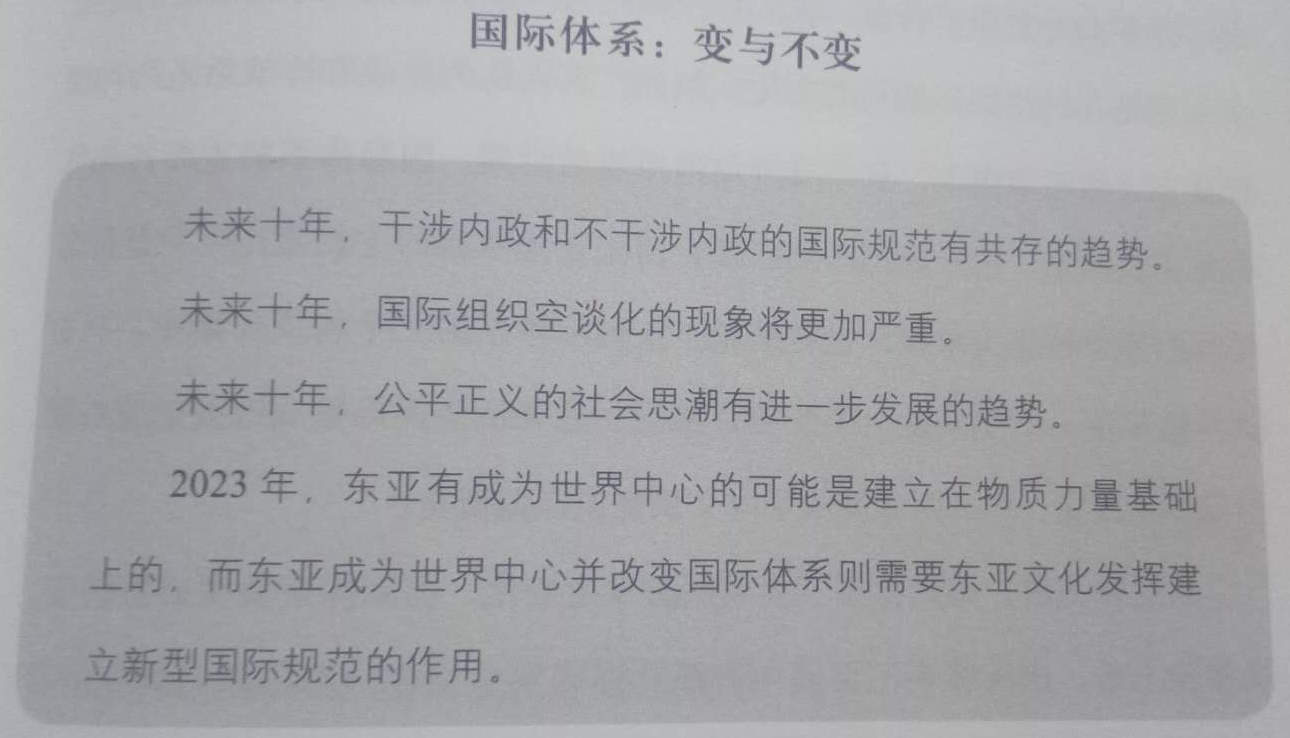 2023年,東亞有成為世界中心的可能是建立在物質力量的基礎上的,而東亞成為世界中心並改變國際體系則需要東亞文化發揮建立新型國際規範的作用。