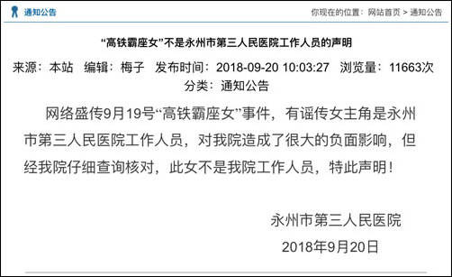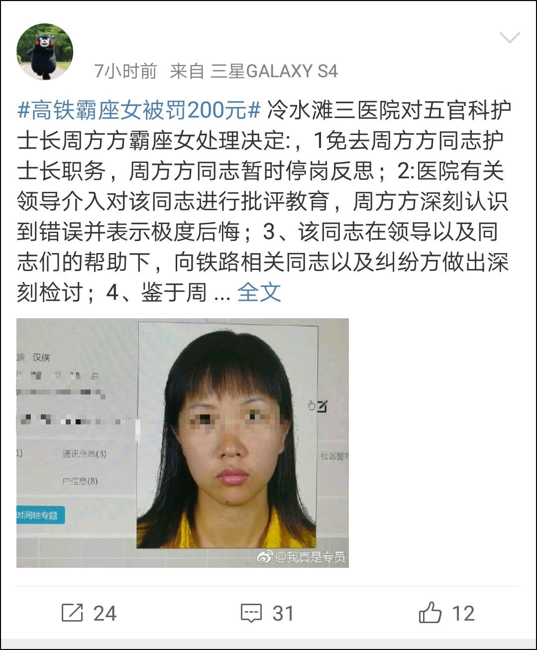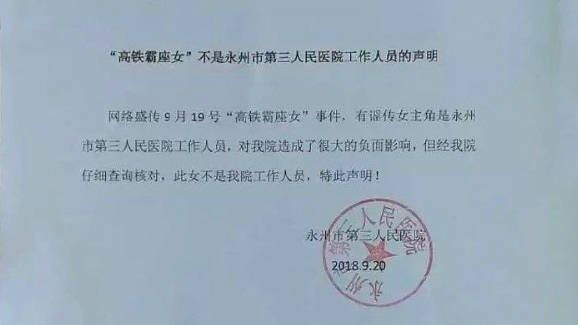 高鐵“霸座女”工作醫院的處理決定也來了?假的!_風聞