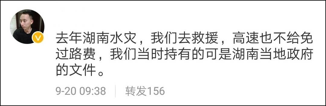 9月19日,河南一義務救援隊對廣東省颱風“山竹”的救援結束,返回時在二廣高速湖南一收費站被卡,要求繳費才能通行,救援隊出示救災證明被否定。收費站工作人員稱這是救災返程,不能免費,沒有接到相關免費通知。(戳這裏看詳細報道)