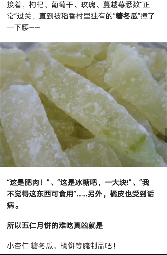文章裏告訴我們,五仁難吃的真兇主要有倆:一個是小杏仁,還有一個是糖冬瓜