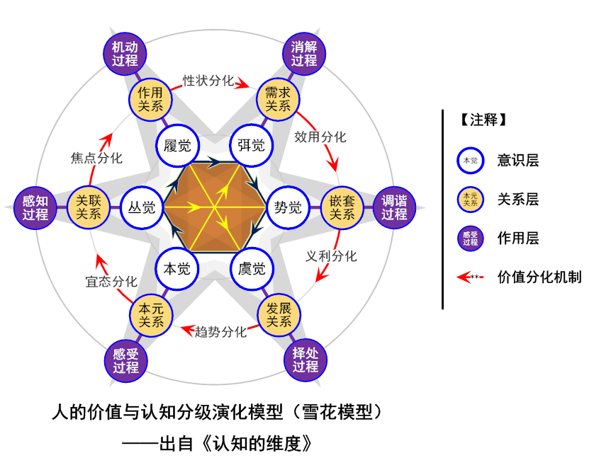 初次查閲這套理論的總體模型框架圖(雪花模型),你一定會驚歎於它不同尋常的美感,因為那活脱脱就是一朵精緻的雪花。人虛無縹緲的思維過程的底層運作邏輯,就藴藏於這朵“雪花”之中。與一般的行為心理學、認知心理學或社會心理學等書籍的描述框架有所不同的是,這本書既不是就事論事,也不是基於具體實驗的實證歸納總結,而是像建設一座巨塔一樣,一層一層壘起來的,並且在逐層建設的過程中,有幾條核心的骨架始終貫穿其中。在初期的建構過程中,可能看不出這套工程到底在建構什麼,而當工程初具規模時,才大體摸清它的建構樣式。支撐巨塔的四座骨架分別為作用層、關係層、意識層和價值分化機制,這些骨架之間又互有影響,其中作用層基於價值分化機制而沉澱出各個關係層,關係層又反過來影響於作用層,關係層的典型邏輯架構則代表了意識層。基於這些相互關聯,可以初步看出建設巨塔的複雜性與嚴密性。但問題在於,為什麼是這樣的一套結構體系?