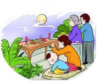 祭月,是孩子們最喜歡的一個環節。不管是剛剛學會走路的小娃娃,還是已經人高馬大的半大小子,都喜歡緊緊地黏在母親身後,開心而不厭其煩地問東問西。到了晚上7點左右,秋季的鄉村在皎潔的月光下就像披上了一層輕柔的白紗。父親擺出家裏吃飯用的大餐桌,用抹布仔細地擦洗乾淨——這代表着對“月亮爹爹”的尊重。之後,他喚出家裏的全部娃娃,“指使”他們拿這遞那,也只有在八月十五這天,家裏的孩子們爭搶着幹活。其實,這也算不上幹活,畢竟他們是在過節呀!擺放餐盤、認真地馬上月餅和水果,再盛出母親剛剛煮好的花生和板栗,就可以請菩薩爹爹來做客啦!
