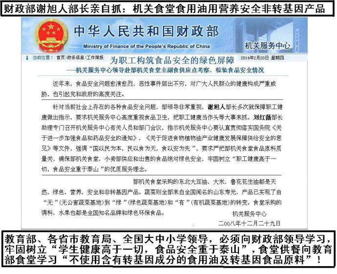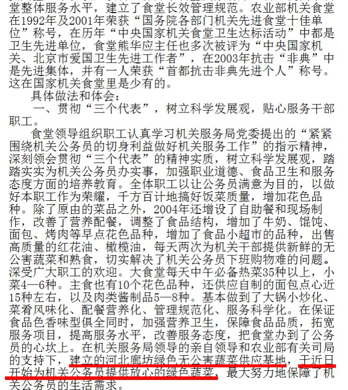 【10年前的農業部機關食堂説明】http://www.ggj.gov.cn/jgfw/jgfwgzdt/200409/t20040920_1254.htm農業部機關食堂自1987年組建17年以來。。。在歷年“中央國家機關食堂衞生達標活動”中都是衞生先進單位。。。增加了食品小超市的品種,出售高質量的紅花油、橄欖油,每天兩次為機關幹部提供新鮮的無公害蔬菜和熟食。。。在機關服務局領導的親自領導和農業部有關司局的支持下,建立的河北廊坊綠色無公害蔬菜供應基地,於近日開始為機關公務員提供放心的綠色蔬菜。。。規定凡食堂供應公務員外帶的食品,質量要求好、衞生標準高,價格低於市場、服務趕超社會