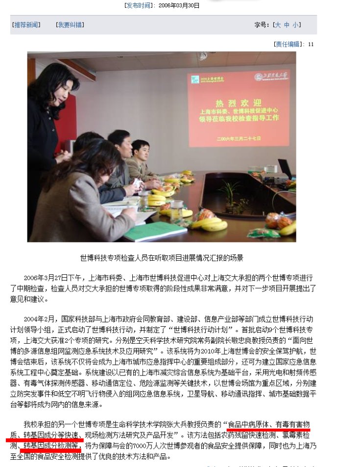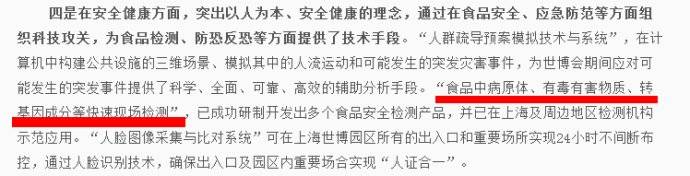 【世博科技行動計劃】(注:該網站已於2014年關閉,此處為去年所泡福爾馬林截圖標本。雖然該網站已關閉,但事關該行動計劃仍可通過上海交大官網當時新聞對此行動計劃予以證實,後面附上上海交大官網截圖證據)食品中病病原體、有毒有害物質、轉基因成分等快速 現場檢測方法研究及產品開發