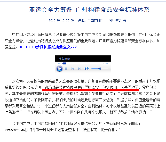【廣州亞運會特供純有機禁止轉基因】http://china.cnr.cn/news/201010/t20101010_507150396.html農場對蔬菜種植過程進行嚴格監控,包括選用非轉基因種子、零度包裝等