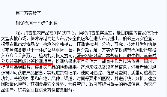 深圳海吉星農產品檢測科技中心,簡稱海吉星實驗室,是目前國內首家依託於大型農批市場、保障深港兩地農產品安全供應和促進農產品進出口的第三方實驗室,探索農批市場食品安全檢測的全新模式,打造集檢測、分析、研究、技術開發和信息發佈等綜合職能於一體的公共服務平台。據介紹,第三方實驗室僅購置檢測設備就投入6000多萬元,檢測能力極大提高,覆蓋農藥殘留、常規理化、微生物、營養成分及轉基因成分等檢測項目