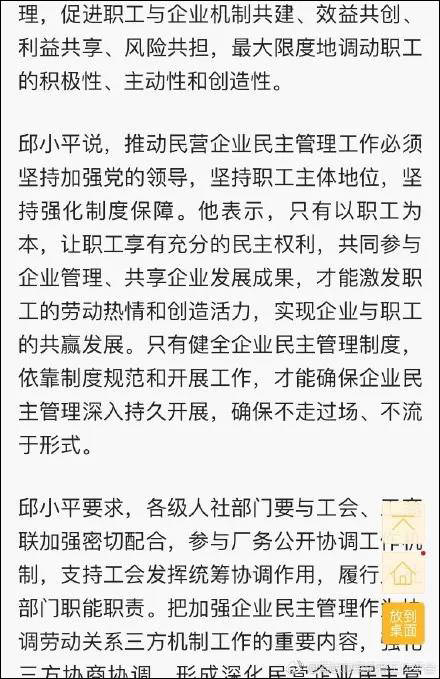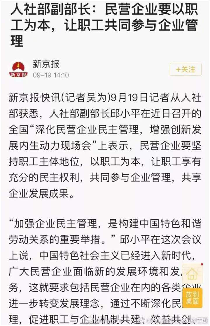 昨天新京報有個新聞,説人社部召開了一個名為“深化民營企業民主管理,增強創新發展內生動力現場會”上發表了講話,稱民營企業應該以職工為本,讓職工共同參與企業管理,共享企業發展成果,要在民營企業內部實現民主,才能激發員工創造的積極性。