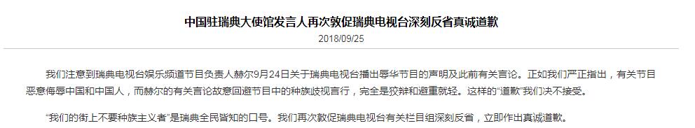9月22日,中國駐瑞典大使館就曾對辱華節目予以強烈譴責和抗議。