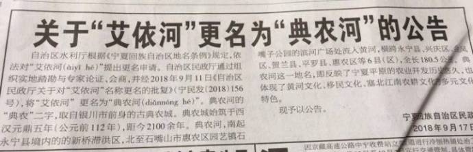 寧夏回族自治區民政廳日前發佈公告稱,民政廳接到水利廳依法對“艾依河”提出的更名申請,同意將該河名稱變更為“典農河”。典農河中的“典農”一詞,取自銀川市前身的古典農城。新的名稱,既反映了寧夏平原的農業開發歷史悠久,也體現了移民文化、塞北江南農耕文化的多元文化特色。