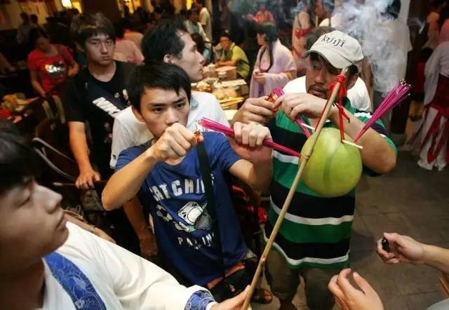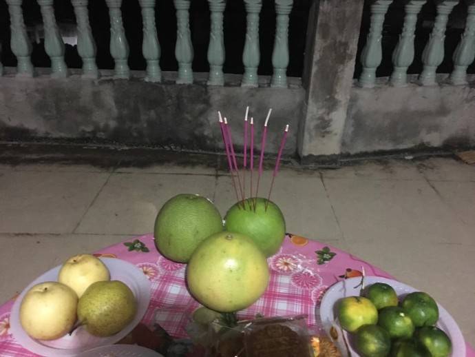在女性拜月結束後,男人們便開始幹活了。會取出一紮細香準備燒柚子香,把它們全部插好在柚子上之後,幾根或十幾根捆綁成一小扎,全部點燃,有的時候也會插上蠟燭……