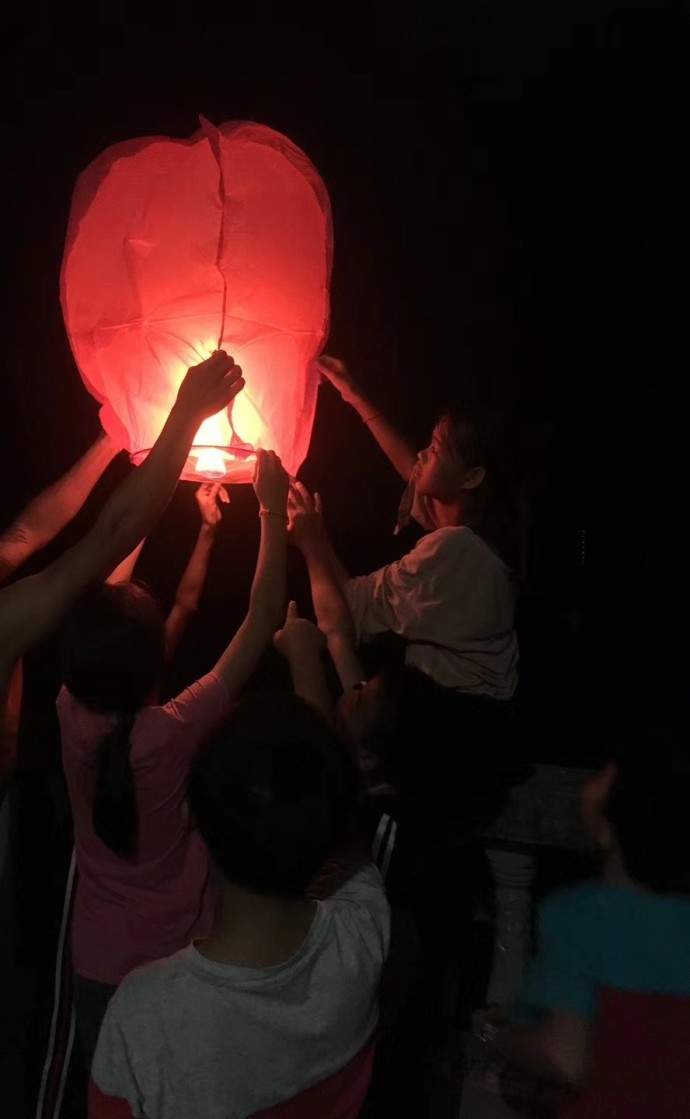 撐開燈衣,點上火,開始感覺到孔明燈在手中、想要掙脱遠去,隨着所有的孩子齊聲喊出“三,二,一,放……”,孔明燈就真的升上了天空,成為了夜空中除了月亮之外的又一處光亮。