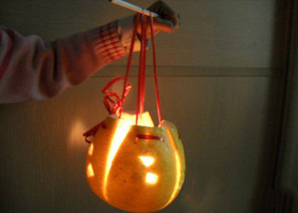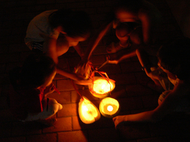 接下來同樣是重頭戲,一家老小拿着白天裏做好的柚子燈,取來蠟燭點燃,小心翼翼地放入燈中,準備拿到河邊去放。