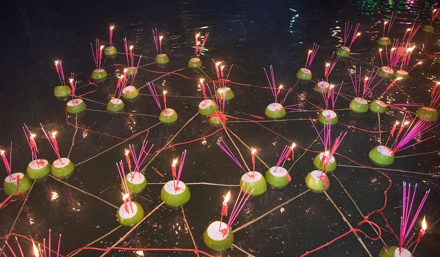 月光照在江面上,柚子燈中的燭光微微地閃爍着,順着河水輕輕地遊蕩,像是一支有如天籟般的歌曲一樣歸去來兮。