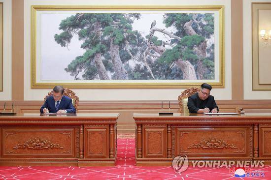 19日,文在寅和金正恩簽署《平壤宣言》的場景。(韓聯社)