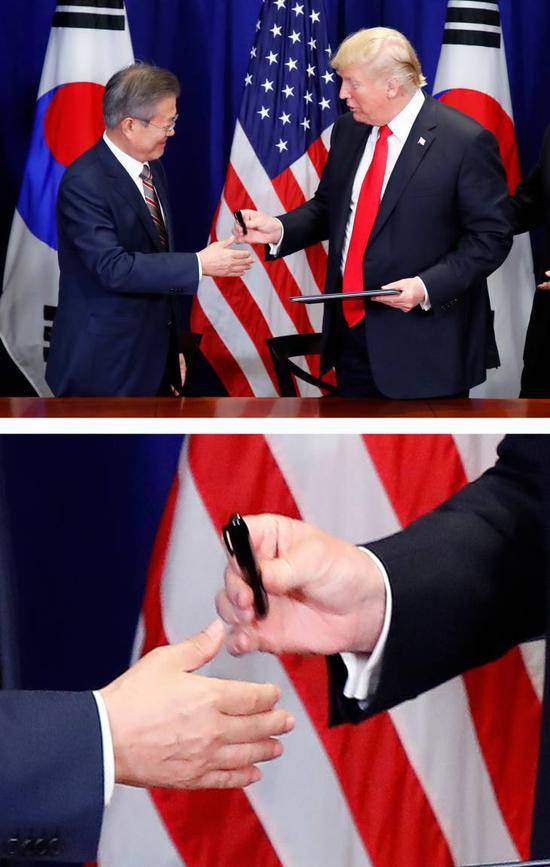 海外網9月26日電 當地時間24日,韓國總統文在寅和美國總統特朗普在紐約簽署了韓美FTA修訂案文件。當時,特朗普出人意料把剛剛用過的一支筆,當場送給了文在寅。結果,這一個小小的舉動,讓韓國網友吵得不可開交,甚至引來韓國總統府青瓦台出面。