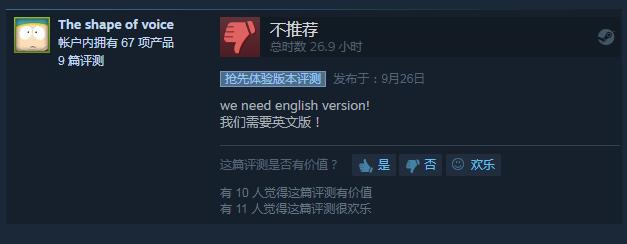 “非常感謝你們的評論。目前,由於遊戲文本較為龐大,我們尚無加入其他支持語言的計劃。如果遊戲能獲得成功,我們就可以僱傭翻譯團隊來進行其他語言的本地化了。假如有一天遊戲添加英文,我們會立刻告知你們的:P。”
