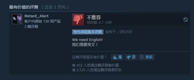 然而,讓人意想不到的是,差評排名第一的評價,竟然是玩家在抱怨遊戲沒有英文!而且不少玩家表示,不給上英文就給差評。