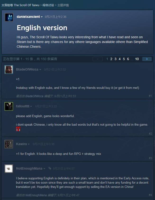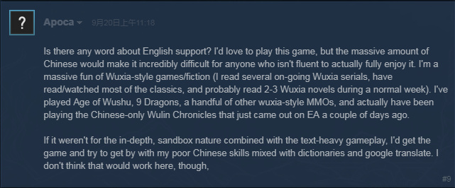 “有什麼關於英文本地化的説法嗎?我超想玩這遊戲,但是遊戲裏大量艱深的中文詞彙對於那些不熟悉中文的人來説實在太難了。我很喜歡武俠題材(Wuxia-style)的遊戲和小説,看過不少武俠電視劇和經典作品,基本每週都要讀2-3本武俠小説。我還玩過《九陰真經OL》(Age of Wushu)、《九龍爭霸》(9 Dragons)和其他一些武俠題材的多人網絡遊戲,前幾天還剛剛試了下《武林志》(Wushu Chronicles)的試玩版。