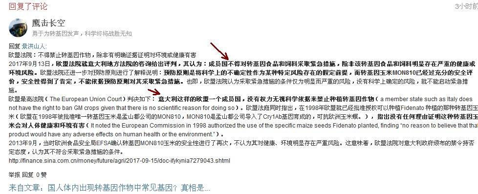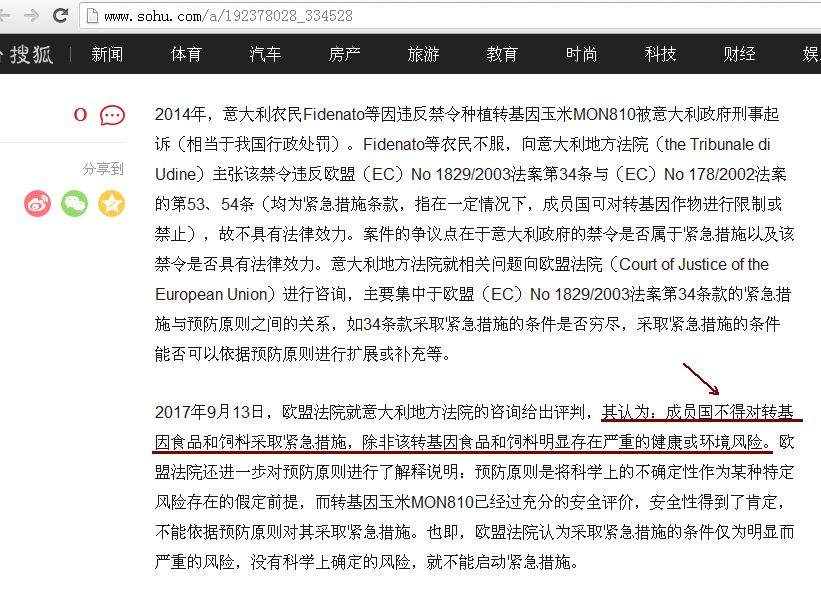 結論是,根據預防原則,允許成員國發現對動物健康及環境構成嚴重風險時,可以採取緊急措施。從文法上,可以反着翻譯,像挺轉派玩的把戲一樣,但前邊有個“預防原則”,alow這個詞就尤其重要。而更可惡的是,曲解還不夠,還要斷章取義,把“基於預防原則”刪掉了。伎倆太拙劣了吧?