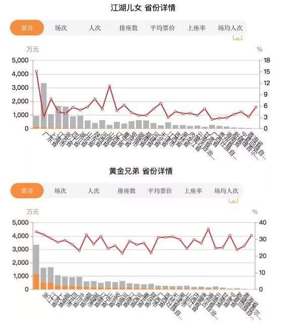 《江湖兒女》《黃金兄弟》中秋節各省票房佔比分佈