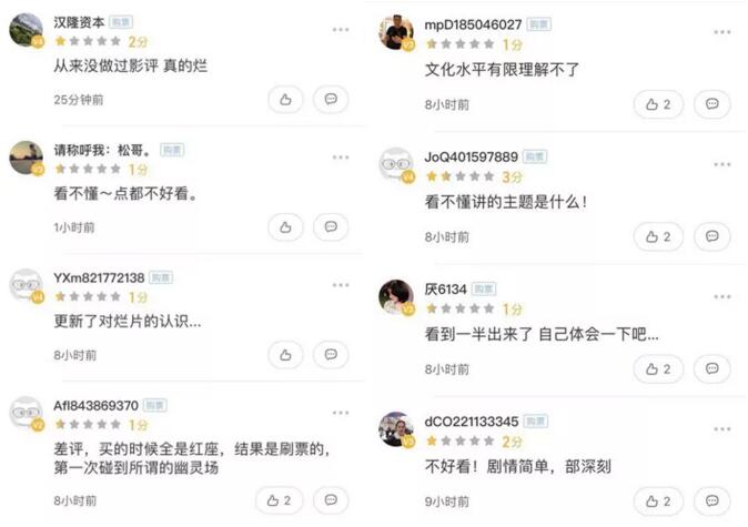 截至目前,《江湖兒女》在淘票票和貓眼上的評分分別為7.9和7.7,均為同檔期電影中的最低分;相比之下,豆瓣評分僅有5.8《悲傷逆流成河》,在貓眼上的評分則高達9.1分。在《江湖兒女》貓眼的最新評論裏,很多觀眾都在抱怨影片“形式大於內容”、“故事太過於簡單”或是“不知道電影想表達什麼”。